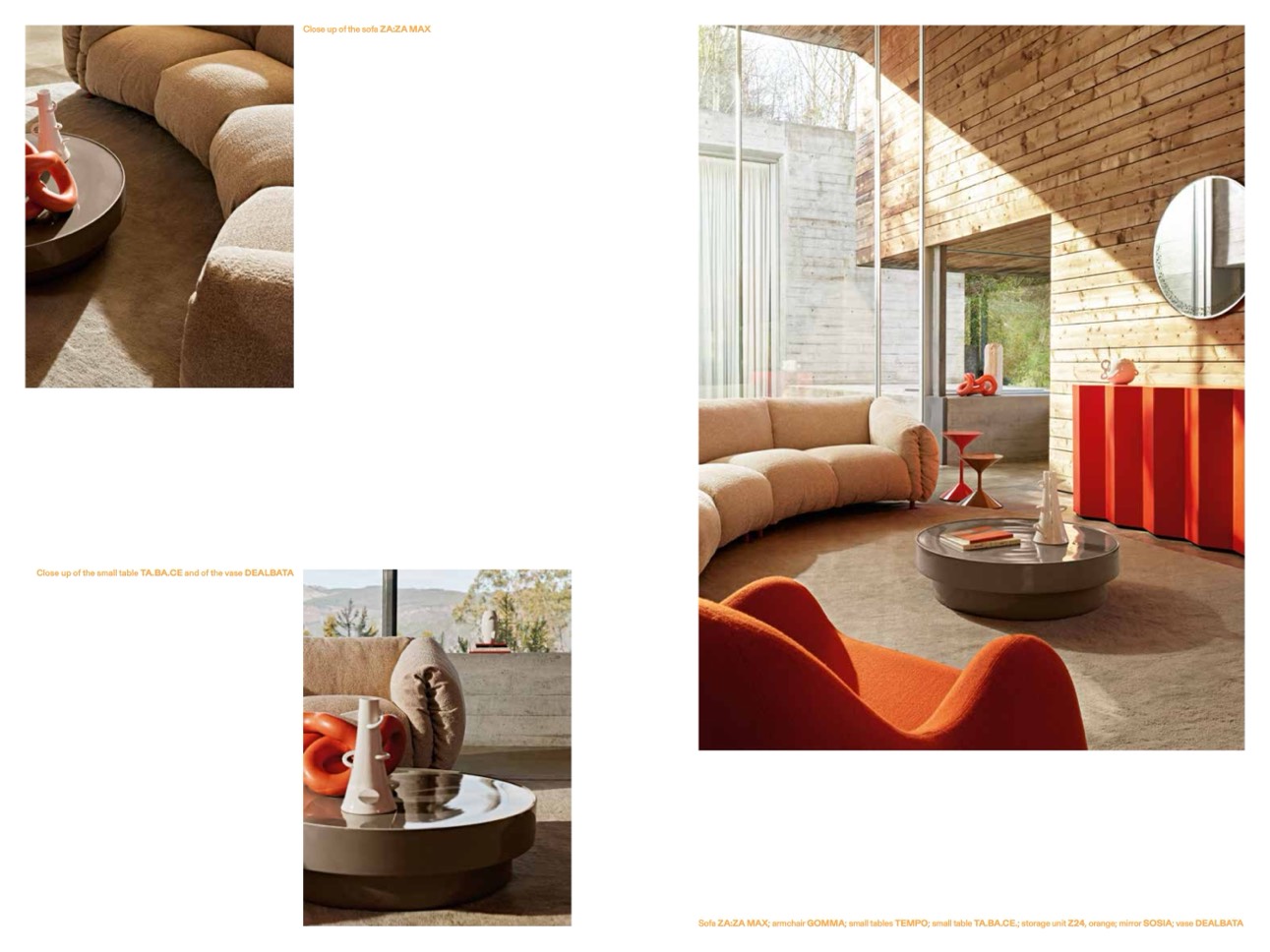 Sofa ZA:ZA MAX; armchair GOMMA; small tables TEMPO; small table TA.BA.CE.; storage unit Z24, orange; mirror SOSIA; vase DEALBATA