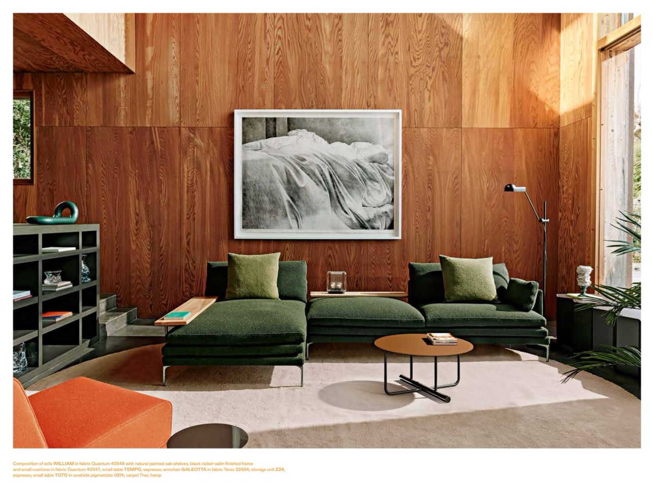 and small cushions in fabric Quantum 40547; small table TEMPO, espresso; armchair GALEOTTA in fabric Terso 32934; storage unit Z24,