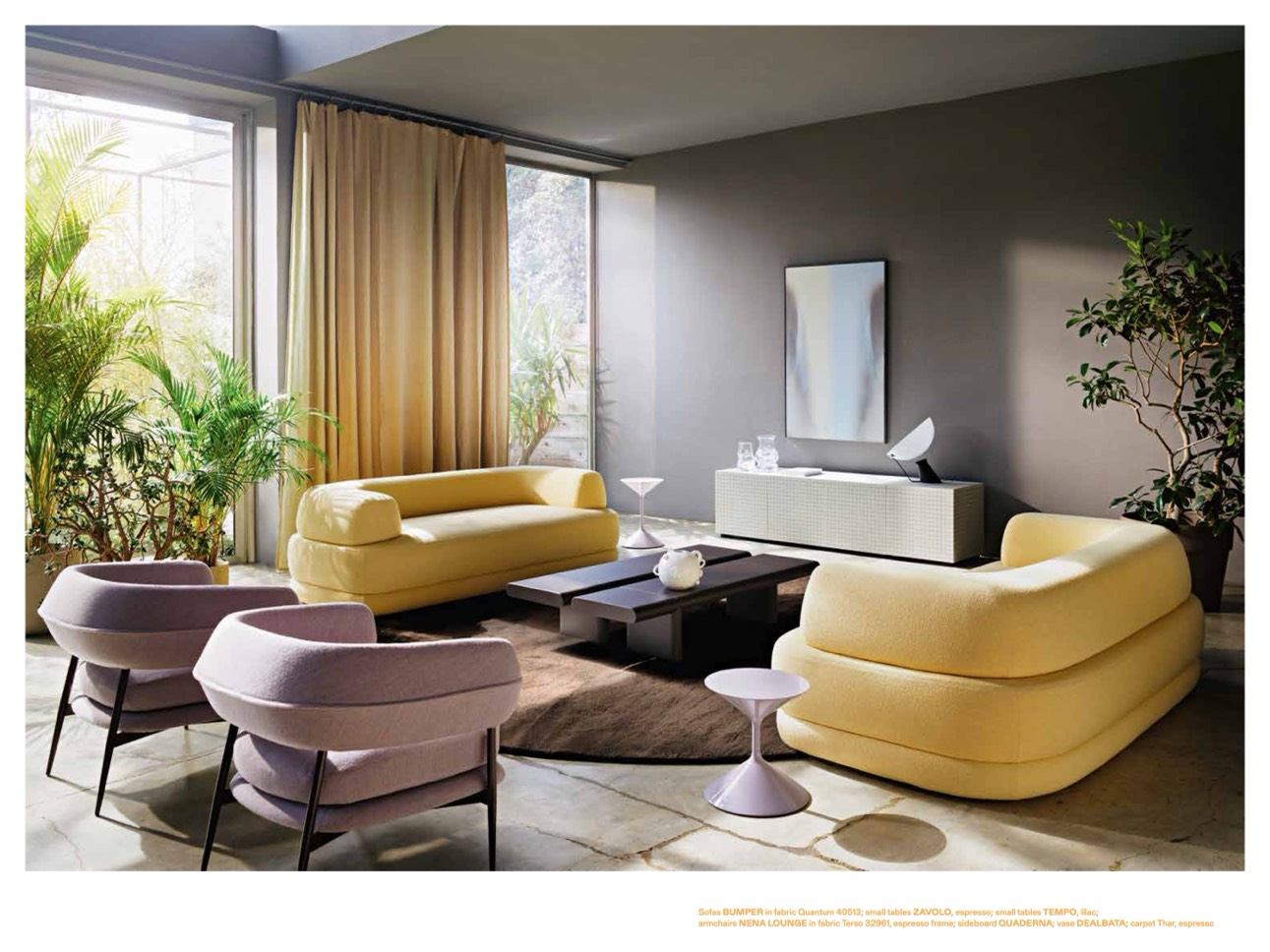 Sofas BUMPER in fabric Quantum 40513; small tables ZAVOLO, espresso; small tables TEMPO, lilac;