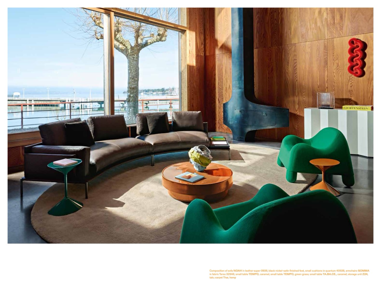 in fabric Terso 32946; small table TEMPO, caramel; small table TEMPO, green grass; small table TA.BA.CE., caramel; storage unit Z24,