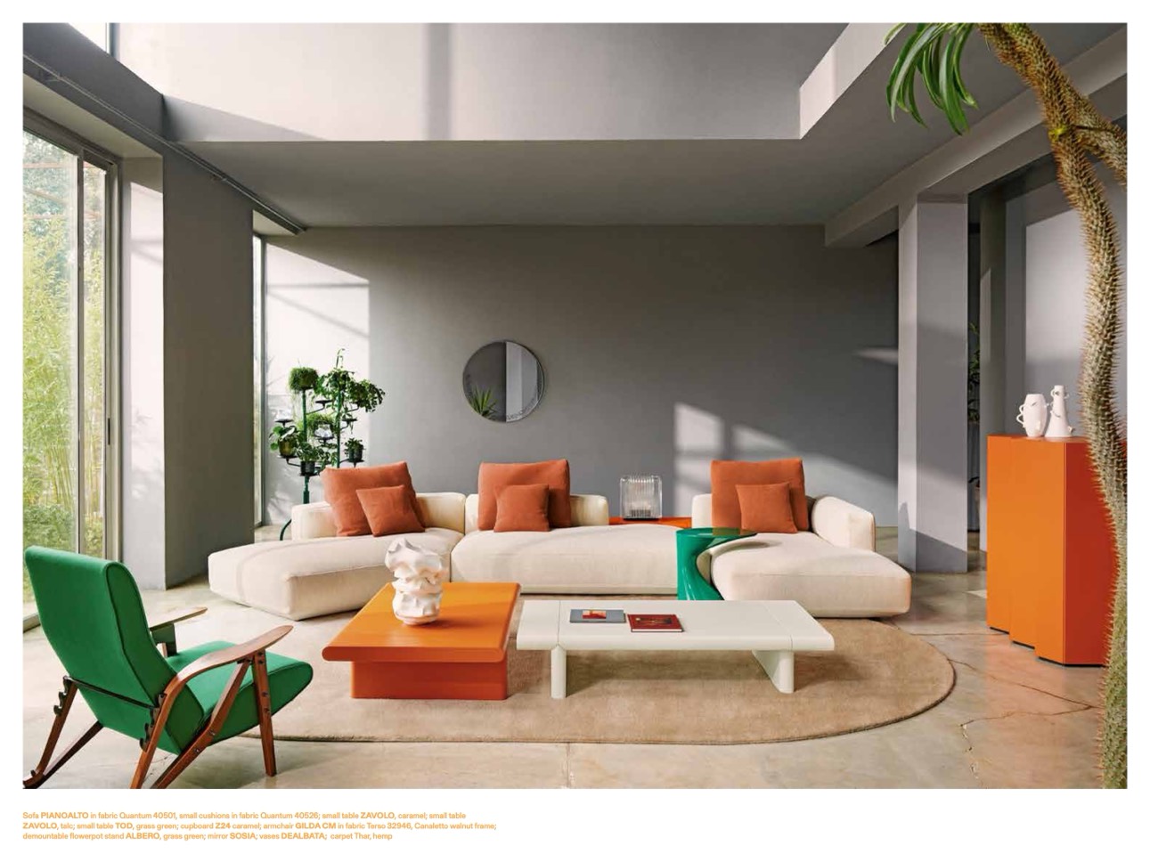 Sofa PIANOALTO in fabric Quantum 40501, small cushions in fabric Quantum 40526; small table ZAVOLO, caramel; small table