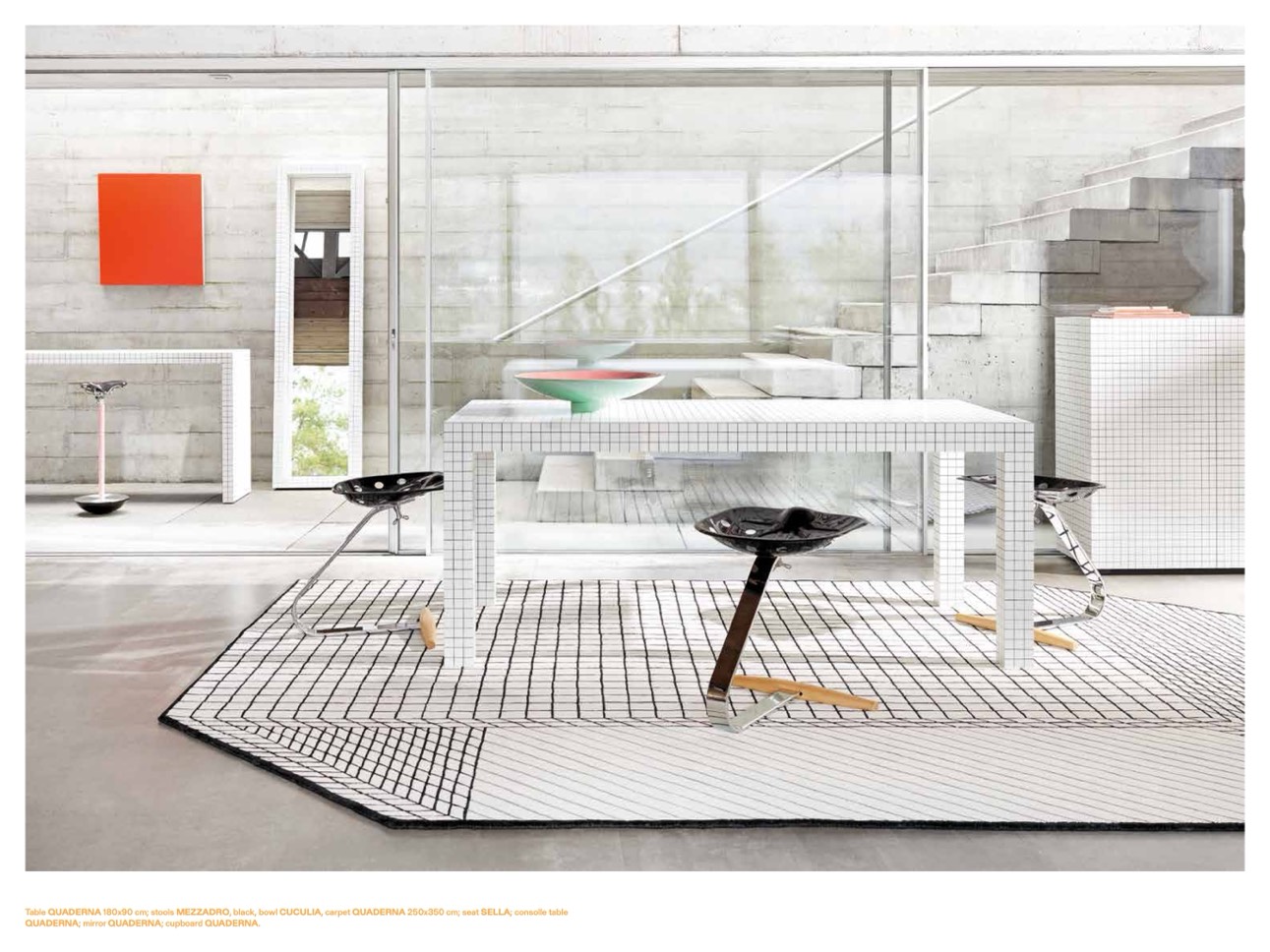 Table QUADERNA 180x90 cm; stools MEZZADRO, black, bowl CUCULIA, carpet QUADERNA 250x350 cm; seat SELLA; consolle table