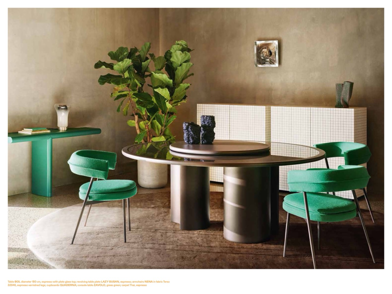 32946, espresso varnished legs; cupboards QUADERNA; console table ZAVOLO, grass green; carpet Thar, espresso