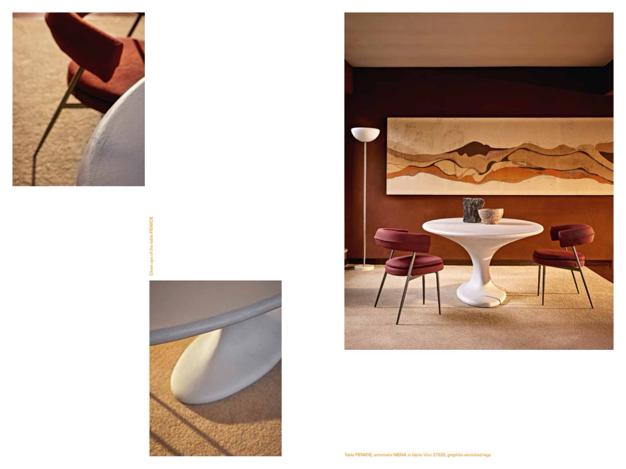 Table FENICE; armchairs NENA in fabric Vico 27826, graphite varnished legs