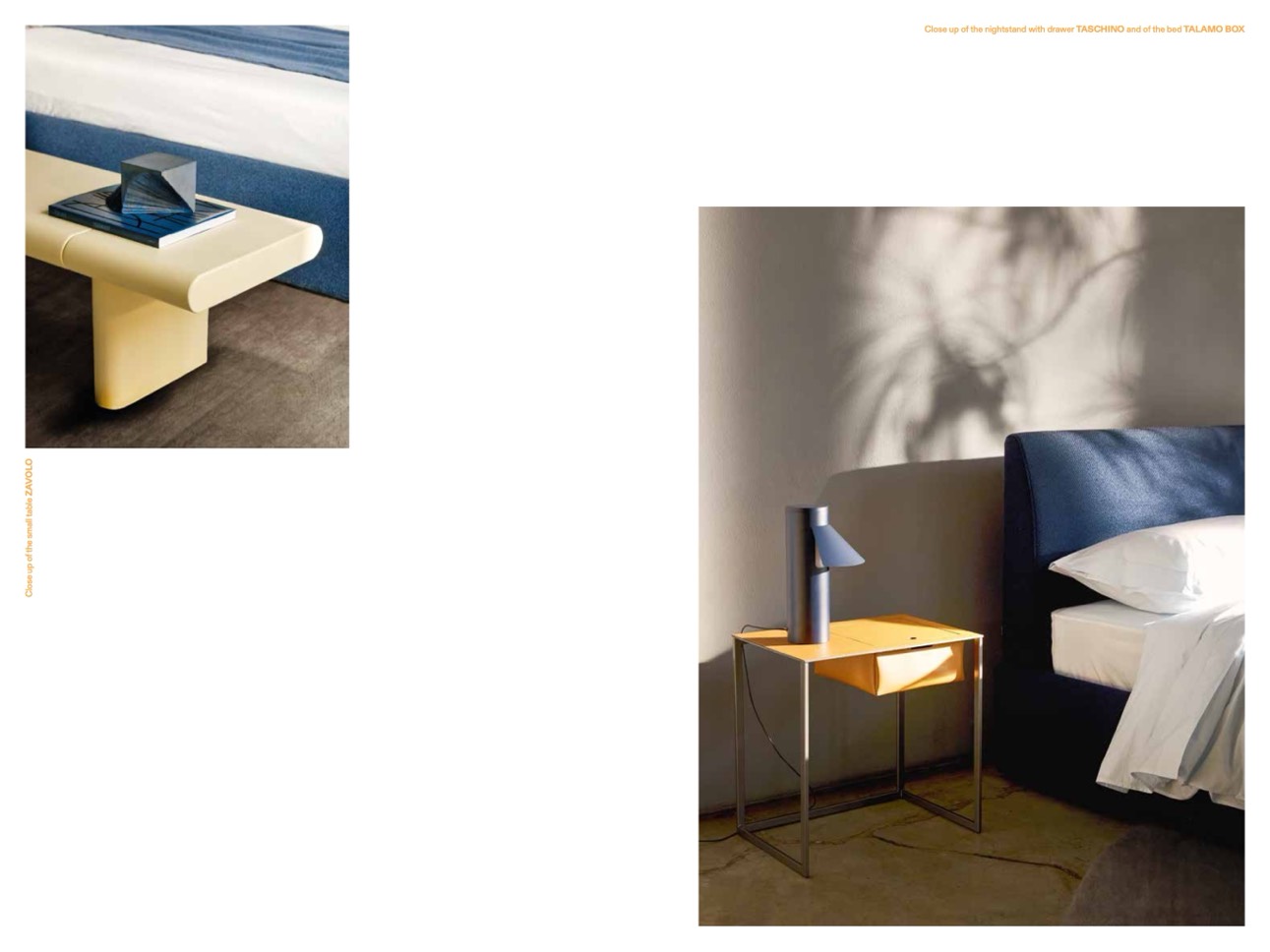Close up of the nightstand with drawer TASCHINO and of the bed TALAMO BOX