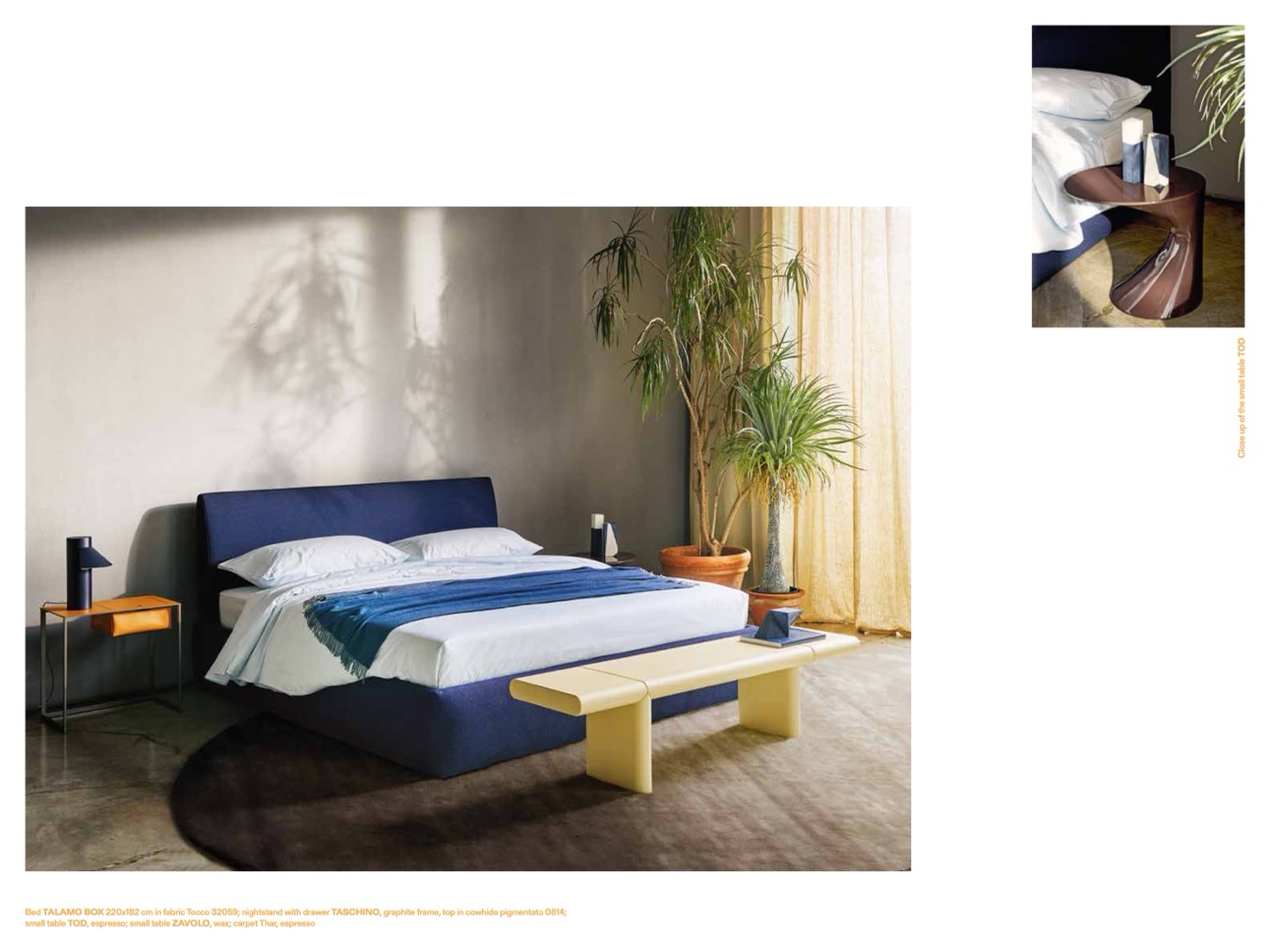 Bed TALAMO BOX 220x182 cm in fabric Tocco 32059; nightstand with drawer TASCHINO, graphite frame, top in cowhide pigmentato 0814;