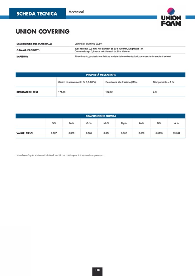 Union Foam S.p.A. si riserva il diritto di modificare i dati sopracitati senza alcun preavviso.
