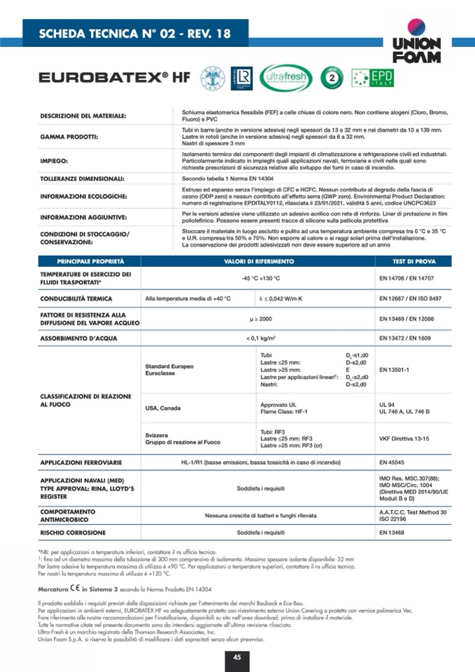 Per applicazioni in ambienti esterni, EUROBATEX HF va adeguatamente protetto con rivestimento esterno Union Covering o protetto con vernice polimerica Vec.