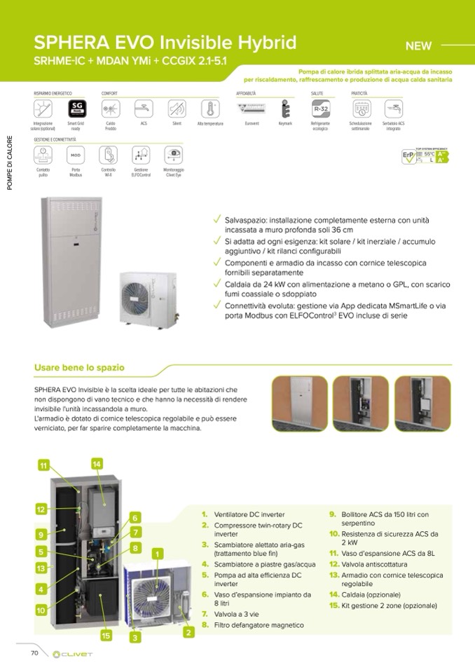 Pompa di calore ibrida splittata aria-acqua da incasso