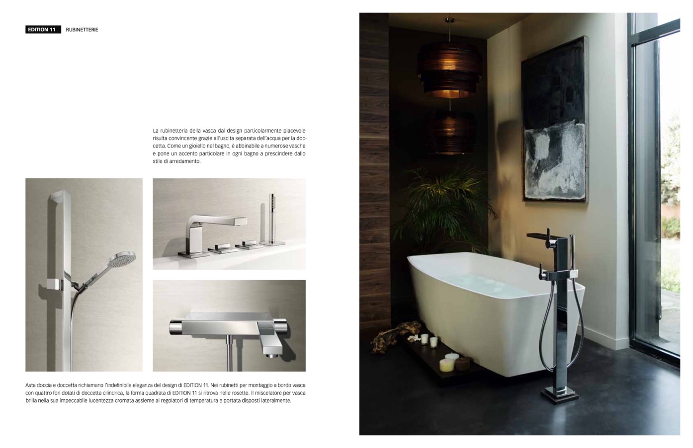 Asta doccia e doccetta richiamano l’indefinibile eleganza del design di EDITION 11. Nei rubinetti per montaggio a bordo vasca