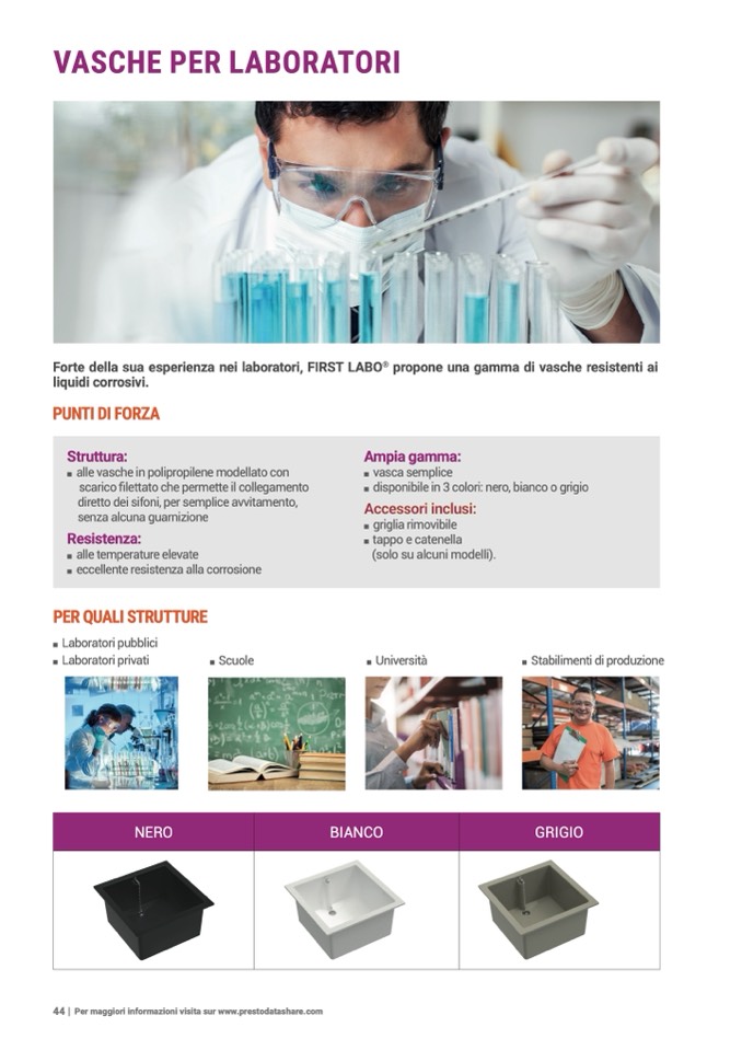 Forte della sua esperienza nei laboratori, FIRST LABO® propone una gamma di vasche resistenti ai