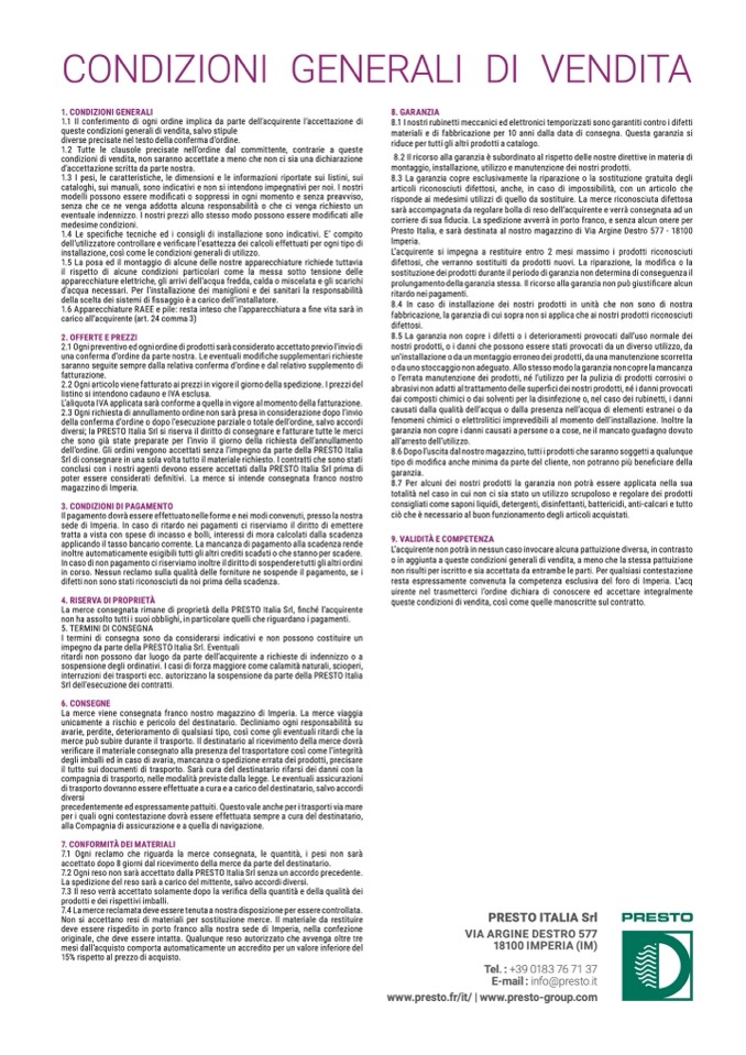7.2 Ogni reso non sarà accettato dalla PRESTO Italia Srl senza un accordo precedente