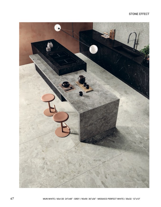 MUN WHITE / 60x120 24”x48” - GREY / 90x90 36”x36” - MOSAICO PERFECT WHITE / 30x32 12”x13”