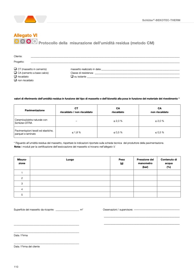 Nota: i moduli per la certificazione dell’essiccazione del massetto si trovano nell’allegato V.
