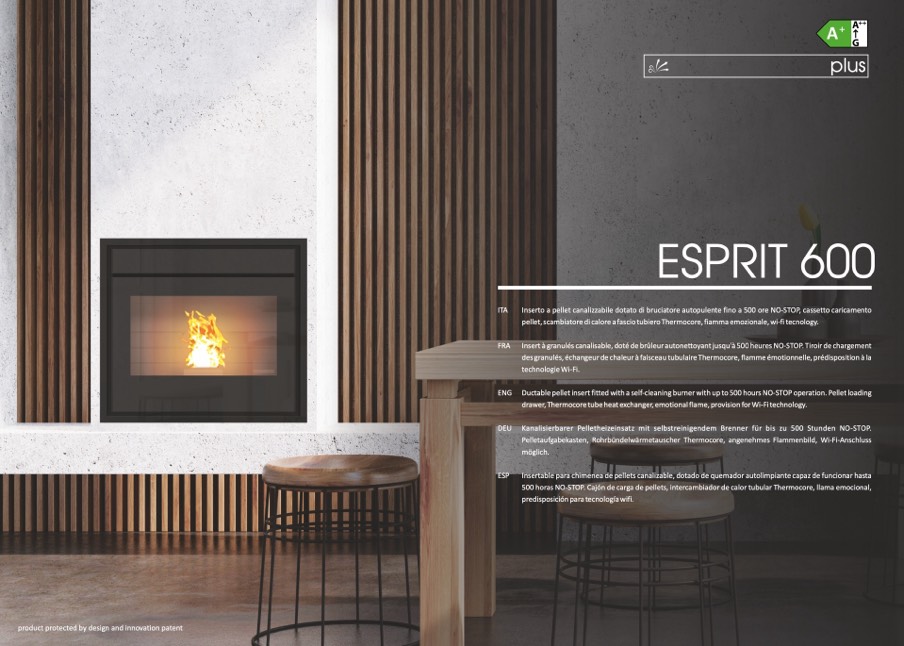 ENG Ductable pellet insert fitted with a self-cleaning burner with up to 500 hours NO-STOP operation. Pellet loading