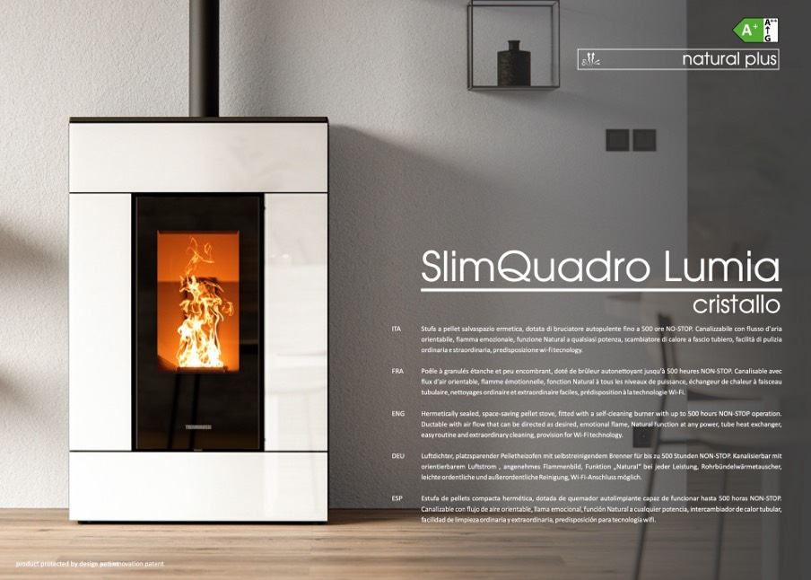 Hermetically sealed, space-saving pellet stove, fitted with a self-cleaning burner with up to 500 hours NON-STOP operation.
