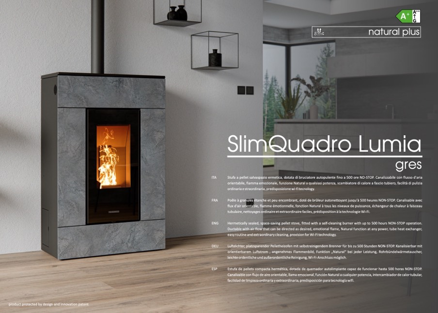 Hermetically sealed, space-saving pellet stove, fitted with a self-cleaning burner with up to 500 hours NON-STOP operation.
