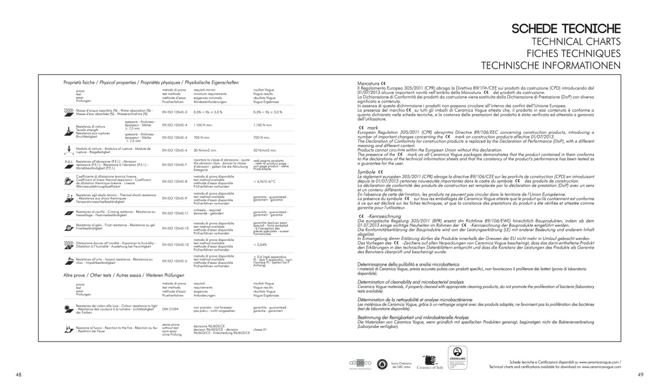 Schede tecniche e Certificazioni disponibili su www.ceramicavogue.com /