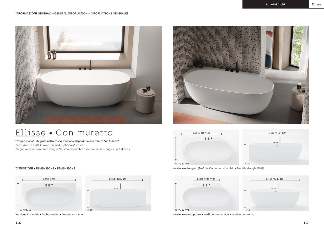 “Troppo pieno” integrato nella vasca, versione disponibile con piletta “up & down”