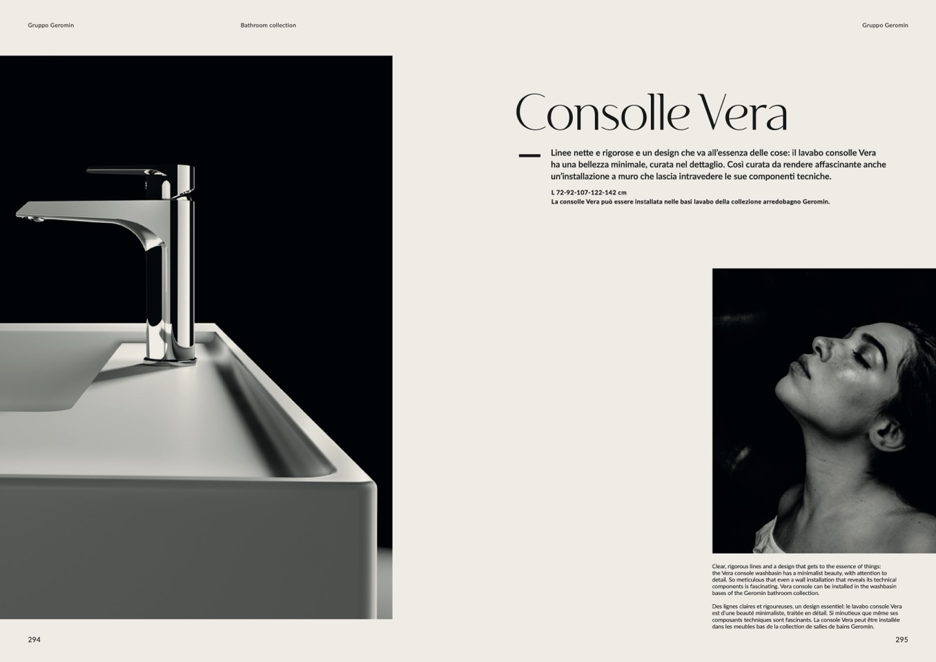 La consolle Vera può essere installata nelle basi lavabo della collezione arredobagno Geromin.