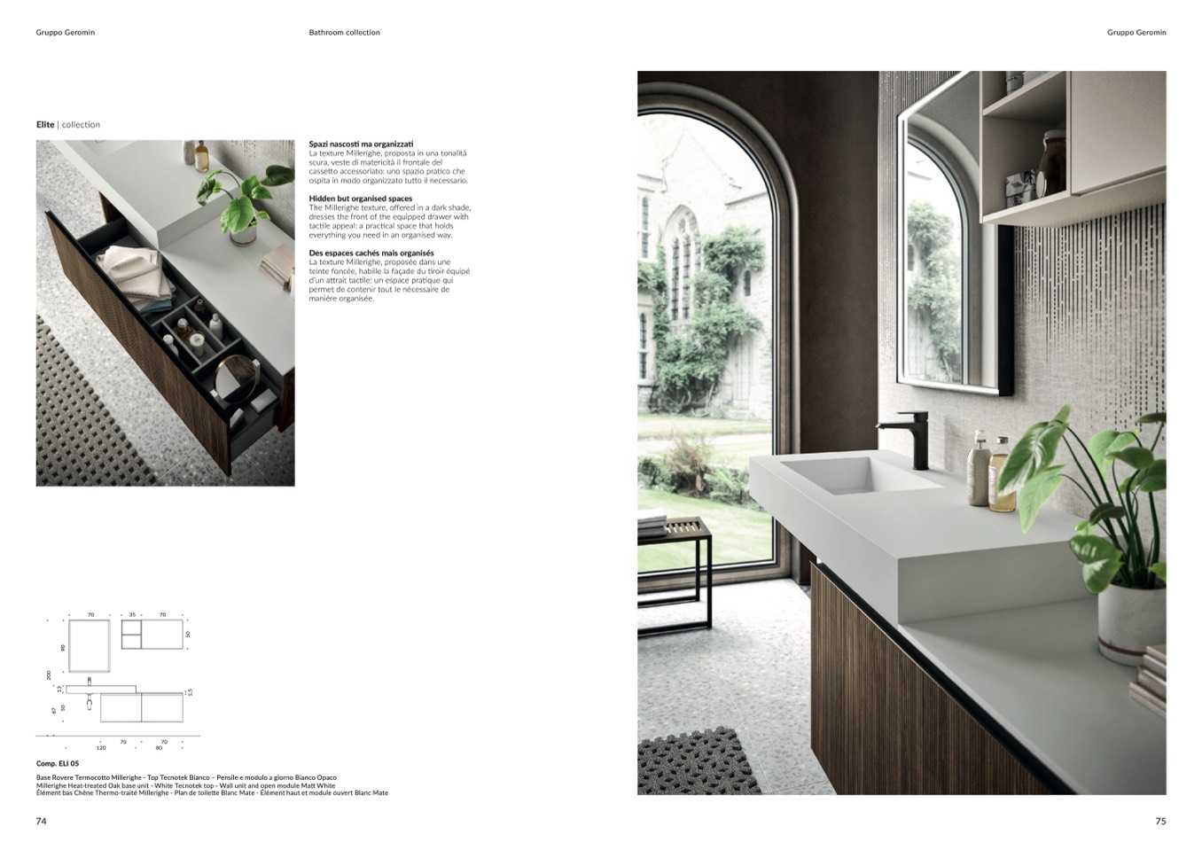 Élément bas Chêne Thermo-traité Millerighe - Plan de toilette Blanc Mate - Élément haut et module ouvert Blanc Mate