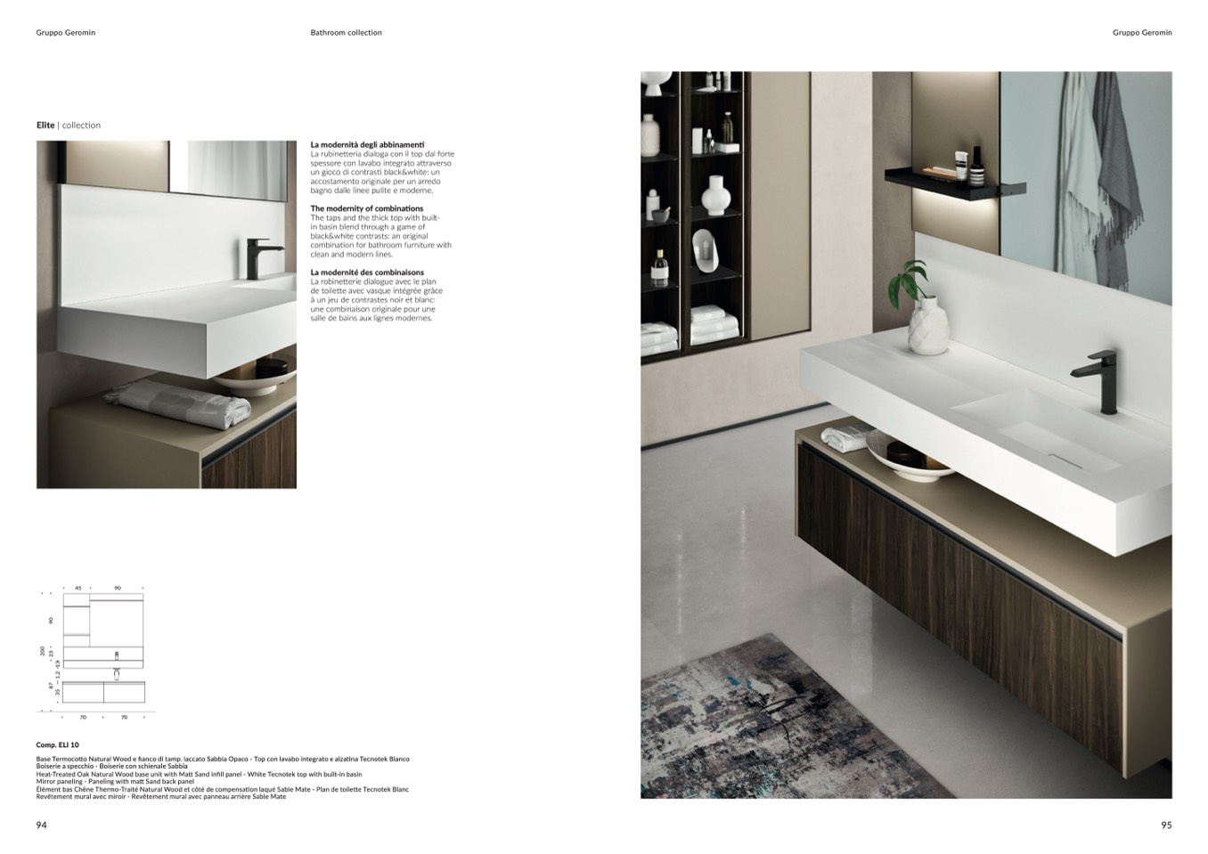 Heat-Treated Oak Natural Wood base unit with Matt Sand infill panel - White Tecnotek top with built-in basin