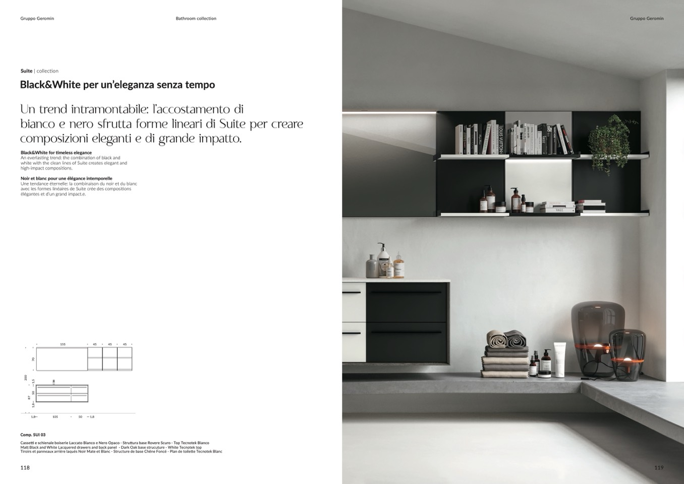 Tiroirs et panneaux arrière laqués Noir Mate et Blanc - Structure de base Chêne Foncé - Plan de toilette Tecnotek Blanc