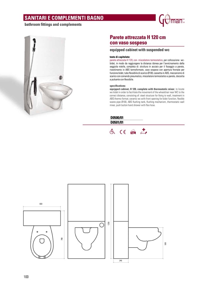 parete attrezzata H 120, con miscelatore termostatico, per collocazione wc-