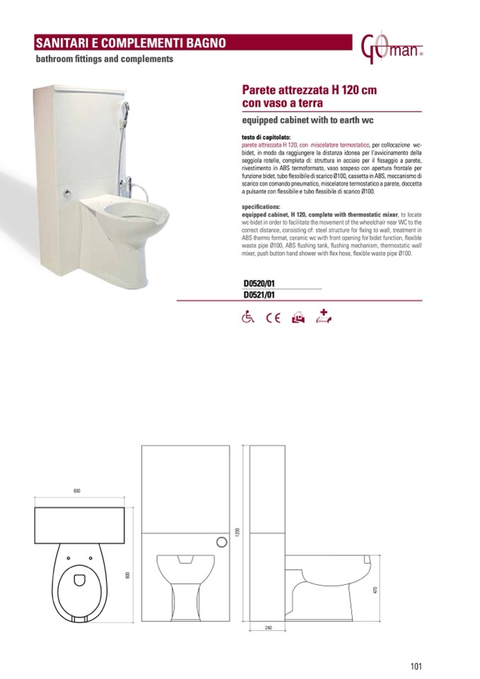parete attrezzata H 120, con miscelatore termostatico, per collocazione wc-