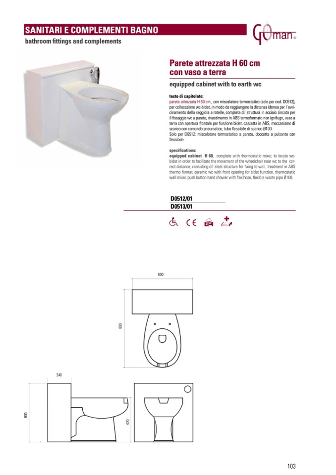equipped cabinet H 60, complete with thermostatic mixer, to locate wc-