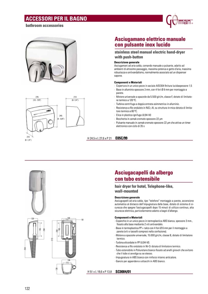 Asciugcapelli ad aria calda, tipo “telefono” montaggio a parete, accensione