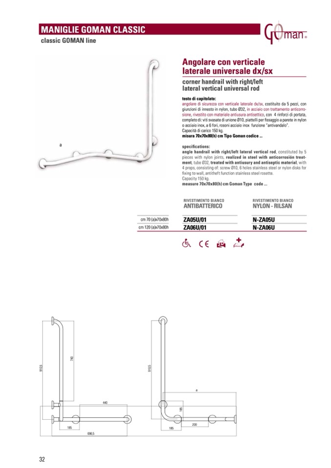 angle handrail with right/left lateral vertical rod, constituted by 5