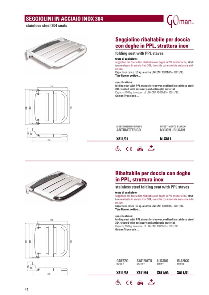 folding seat with PPL staves for shower, realized in stainless steel