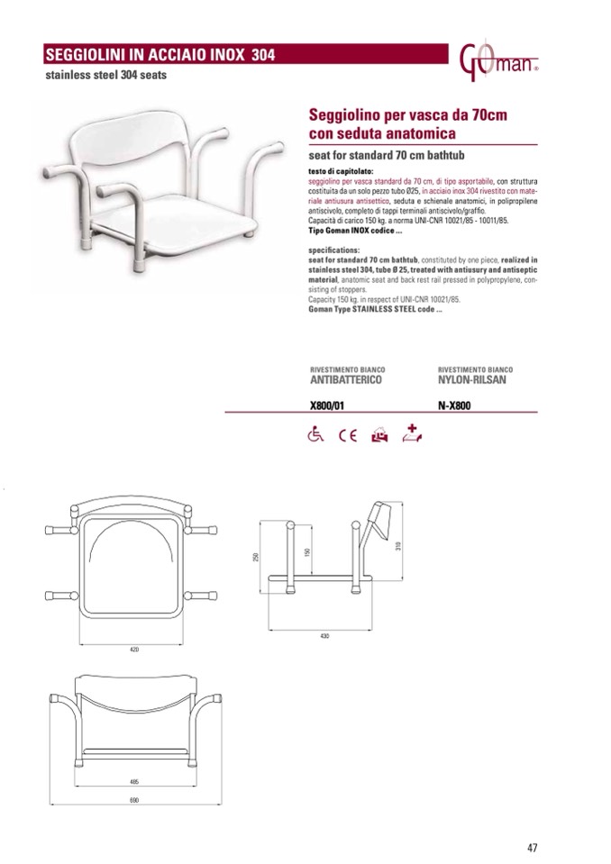 seat for standard 70 cm bathtub, constituted by one piece, realized in