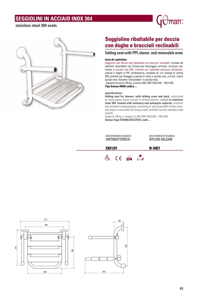 seggiolino per doccia tipo ribaltabile con braccioli reclinabili, formato da