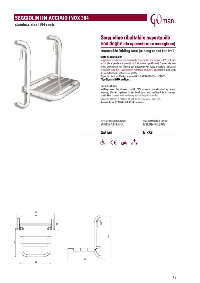 seggiolino per doccia tipo ribaltabile asportabile con doghe in PPL antibat-
