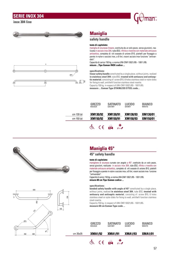 maniglione di sicurezza curvato con angolo a 45°, costituito da un solo pezzo,