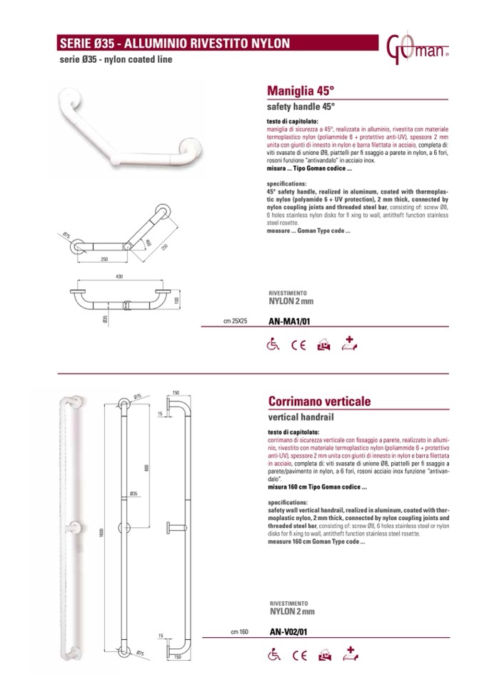 45° safety handle, realized in aluminum, coated with thermoplas-