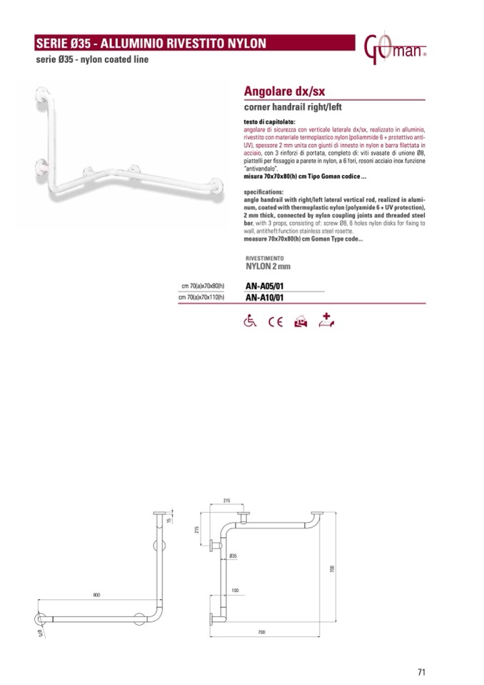 angle handrail with right/left lateral vertical rod, realized in alumi-
