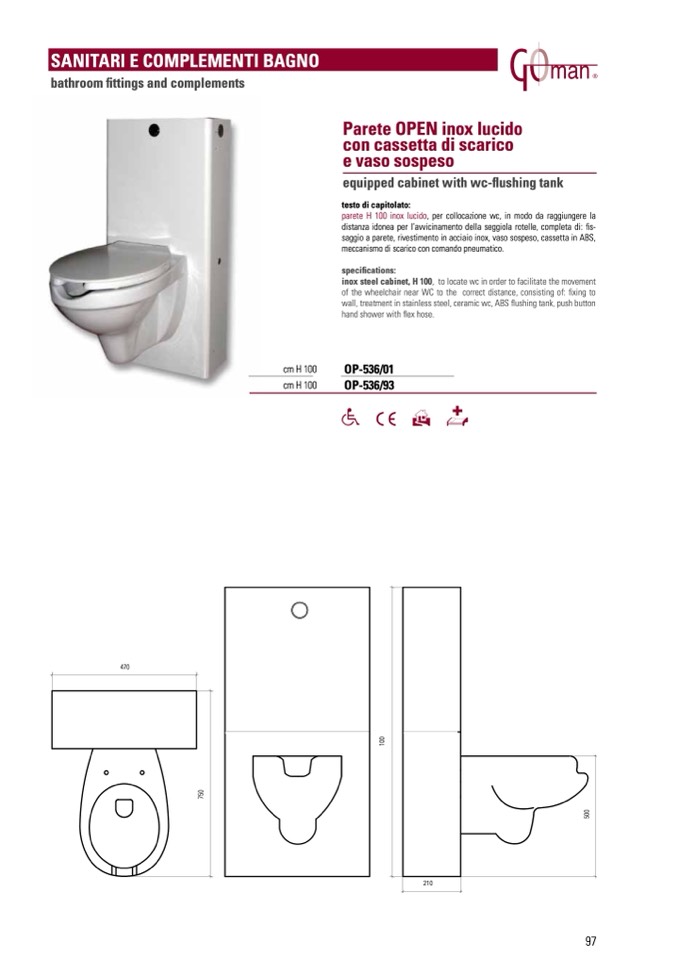 wall, treatment in stainless steel, ceramic wc, ABS flushing tank, push button