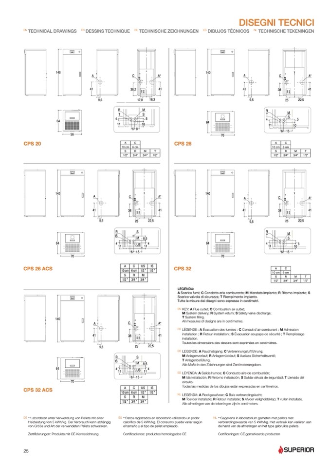 A Scarico fumi; C Condotto aria comburente; M Mandata impianto; R Ritorno impianto; S