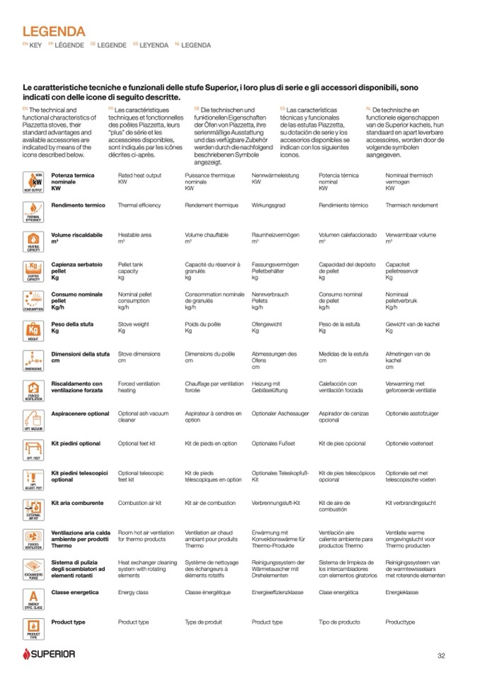 Le caratteristiche tecniche e funzionali delle stufe Superior, i loro plus di serie e gli accessori disponibili, sono