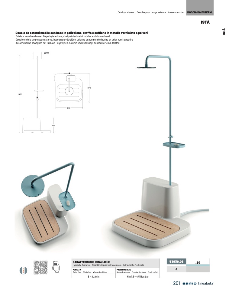 Doccia da esterni mobile con base in polietilene, staffa e soffione in metallo verniciato a polveri