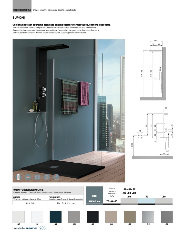 Aluminium shower column complete with with thermostatic mixer, shower heads and hand shower