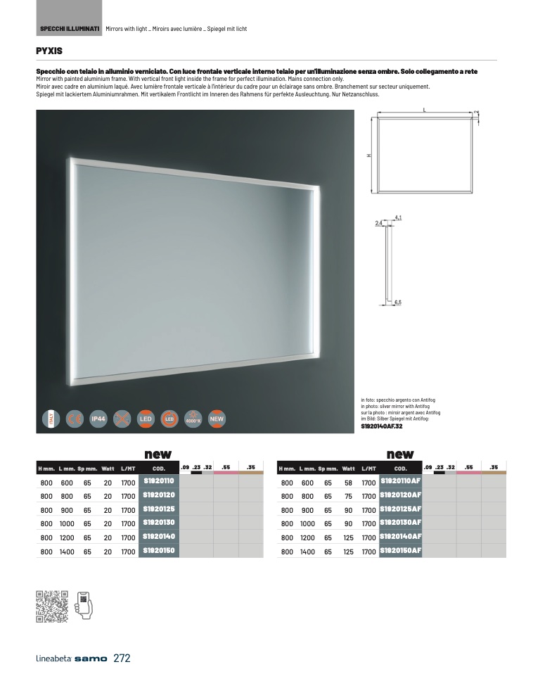 Mirror with painted aluminium frame. With vertical front light inside the frame for perfect illumination. Mains connection only.