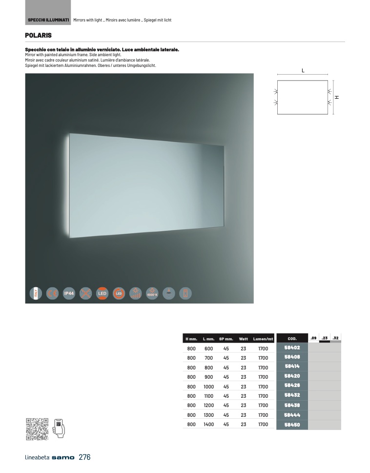 Specchio con telaio in alluminio verniciato. Luce ambientale laterale.