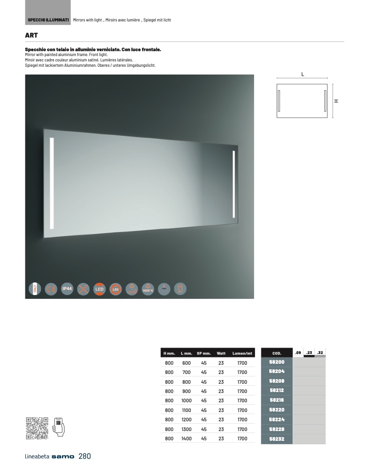 Specchio con telaio in alluminio verniciato. Con luce frontale.