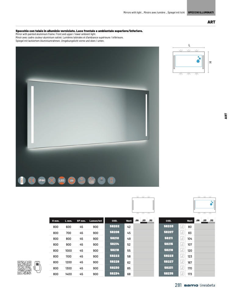 Specchio con telaio in alluminio verniciato. Luce frontale e ambientale superiore/inferiore.
