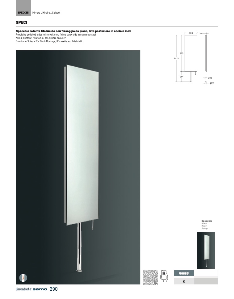 Revolving polished sides mirror with top fixing, back side in stainless steel