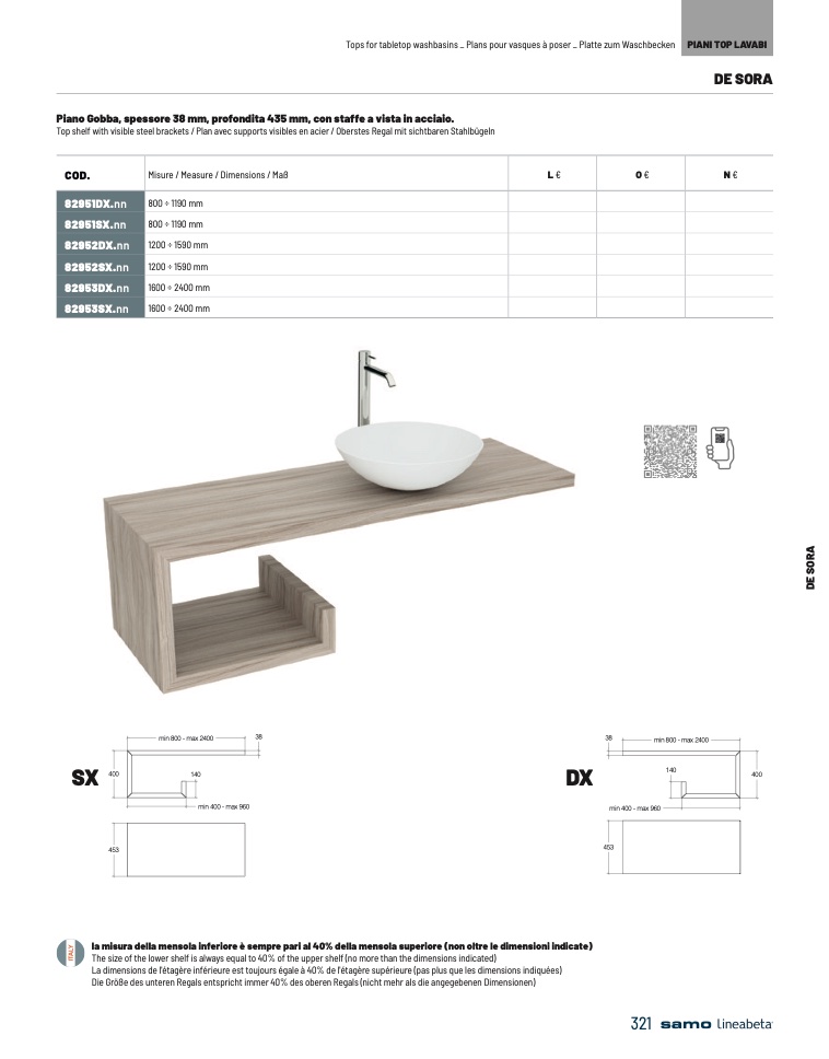 la misura della mensola inferiore è sempre pari al 40% della mensola superiore (non oltre le dimensioni indicate)